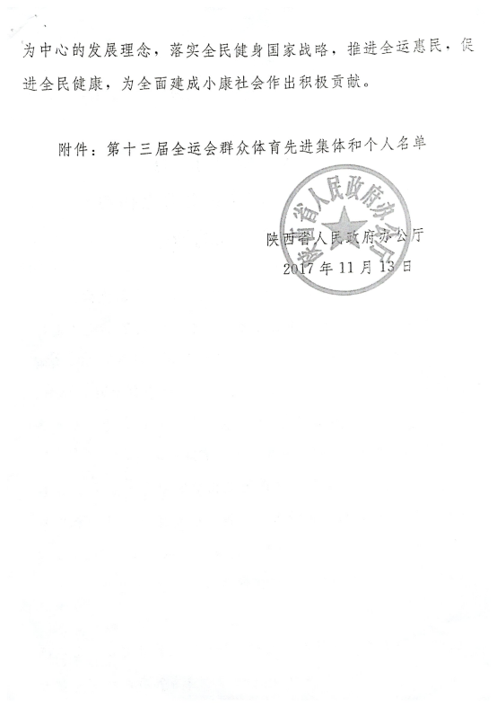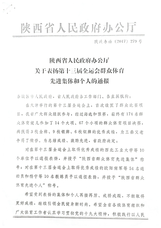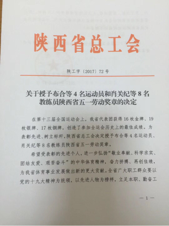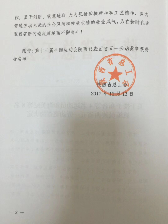 喜訊:陜西省人民政府辦公廳授予公司員工楊力驍陜西省群眾體育先進個人 及陜西省總工會授予公司員工楊力驍陜西省五一勞動獎章