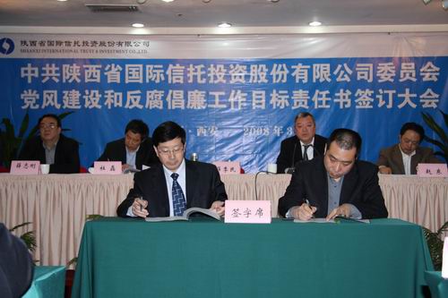 2008年3月31日,我公司在神州高速酒店唐廳召開了黨風建設和反腐倡廉目標責任書簽訂大會。公司黨委副書記、紀委書記黎惠民主持會議,并宣讀了《中共陜西省國際信托投資股份有限公司委員會2008年度黨風建設和反腐倡廉工作要點》;公司黨委書記、董事長薛季民同志分別與各部門(單位)負責人簽訂《部門(單位)黨風建設和反腐倡廉工作目標責任書》。會議要求各部門(單位)會后開展一次廉潔從業教育,并組織員工認真簽署《員工廉潔從業承諾書》。