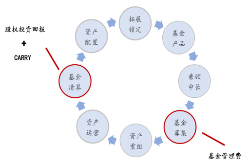 基于不同業務及基金產品結構,地產基金有不同的收益組合。主要盈利點包括基金管理費、業績提成(CARRY,限股權類基金)和股權投資回報(作為LP的投資收益)。