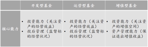 從地產基金價值鏈看,基金管理人需具備募集能力、投資能力、風控能力和資管能力。這些能力在不同類型的地產基金中各有側重,但投資與資管一定都是最核心的能力要求。