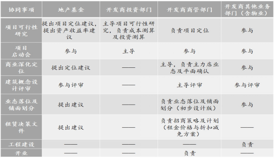 其中,基金與商業開發關鍵協同點主要在商業項目定位、投資決策及開業前期,通過對項目定位、租賃決策等核心決策事項的參與,保證后期資產改造成本最低。