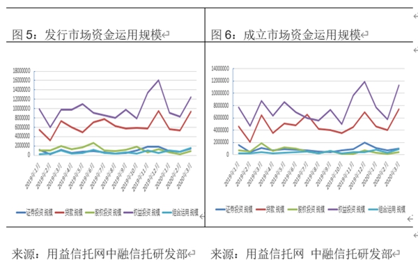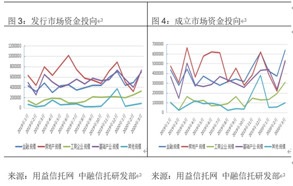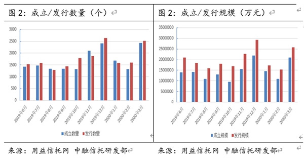 用益信托公布的數據顯示,逐步復工后,3月集合信托市場發行和成立市場出現強勢反彈。具體來看,2020年3月共有59家信托公司參與發行,56家信托公司成立產品。其中發行產品數量2512個,環比上漲57.9%,成立產品數量2439個,環比上漲85.8%;發行和成立產品規模方面同樣表現良好,其中發行市場規模2572.08億元,環比增長66.7%,成立市場規模2103.57億元,環比上漲92.2%。發行和成立規模在放在2019年來看,也僅低于12月,規模排在第二位。