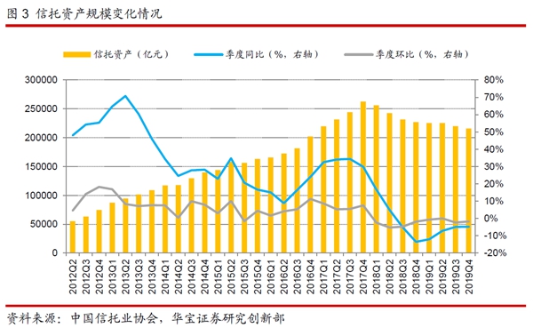 從信托資產(chǎn)規(guī)模的季度增速變化來看,2019年四個季度,信托資產(chǎn)同比增長速度分別為-12%、-7.15%、-4.94%和-4.83%,季度同比數(shù)據(jù)持續(xù)處于負值區(qū)間,不過從趨勢上看,季度同比數(shù)據(jù)在2018年四季度創(chuàng)階段性低點后,連續(xù)四個季度降幅收窄;季度環(huán)比來看,2019年四個季度環(huán)比增速分別為-0.71%、-0.02%、-2.39%和-1.78%,信托資產(chǎn)規(guī)模連續(xù)四個季度縮水。