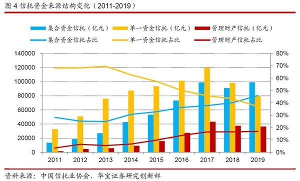 2019年以來,在監(jiān)管政策的引導下,信托業(yè)持續(xù)縮減傳統(tǒng)銀信通道類業(yè)務,此類業(yè)務被歸結(jié)為單一資金信托,因此單一資金信托占比進一步下降。2019年末,單一資金信托規(guī)模達到8.01萬億,較年初下滑18253億元,規(guī)模占比由年初的43.33%下降到37.1%。