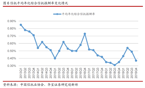 從上述兩個角度來分析信托產(chǎn)品的結(jié)構(gòu)我們可以發(fā)現(xiàn),“資管新規(guī)”落地后,通道與多層嵌套業(yè)務不斷清理與壓縮,信托公司主動管理能力增強,信托業(yè)務結(jié)構(gòu)優(yōu)化。這帶動了信托報酬率從2018年四季度開始連續(xù)3個季度的回升,2019年二季度平均年化綜合報酬率為0.54%,相對于2018年三季度的階段性低點提高0.23個百分點。不過由于2019年下半年監(jiān)管部門加大了風險排查的力度和頻率,之前被隱匿的風險得到了更加充分的暴露,使得信托報酬率在下半年出現(xiàn)了回落。