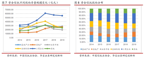 從納入資管新規(guī)的資金信托的情況來看,截止2019年末,資金信托規(guī)模為17.94萬億元,較2018年末下降1.01萬億,同比增速-5.35%。
