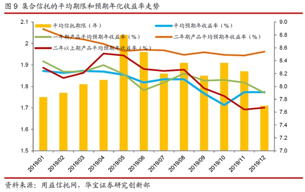 產(chǎn)品收益:根據(jù)用益信托網(wǎng)不完全數(shù)據(jù)顯示,2019年,已公布的集合理財類信托產(chǎn)品的平均收益率為8.16%,與2018年相比平均收益率上行22個bp;其平均信托年限為1.86年,與2018年持平。從預期年化收益率的趨勢來看,2019年月度新發(fā)集合信托平均預期年收益率呈明顯的下降趨勢。疫情加大經(jīng)濟衰退風險,全球流動性大幅投放,“資產(chǎn)荒”的壓力進一步增大,預計2020 年集合信托產(chǎn)品的平均預期收益率仍然有一定的下行空間。