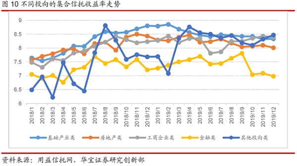 從預期年化收益率的趨勢來看,2019年月度新發(fā)集合信托平均預期年收益率呈明顯的下降趨勢,12月份的月均發(fā)行利率比1月份低33BP。分期限來看,一年期產(chǎn)品平均預期年化收益率為8.19%,二年期產(chǎn)品平均預期年化收益率為8.63%,二年以上期限的產(chǎn)品平均預期年化收益率為8.26%,各期限的產(chǎn)品收益率均呈下降的趨勢。分不同投向來看,2019年基礎(chǔ)產(chǎn)業(yè)類信托平均預期收益率為8.44%,較2018年上行2bp,收益率全年呈下降趨勢;房地產(chǎn)類信托平均預期收益率為8.2%,較2018年上行10bp,收益率全年亦呈下降趨勢;工商企業(yè)類信托平均預期收益率為8.26%,較2018年上行25bp,全年收益率走勢呈“V型”的走勢,可能與工商企業(yè)類信托風險事件增多之后對風險溢價的要求提高有關(guān);金融類信托平均預期收益率為7.24%,較2018年下行7bp,收益率的走勢呈先走高后回落的趨勢。