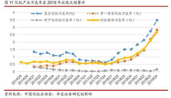 2019年,宏觀經(jīng)濟下行壓力增大、監(jiān)管主動處置化解風險的背景下,信托行業(yè)風險項目和不良率明顯提升。