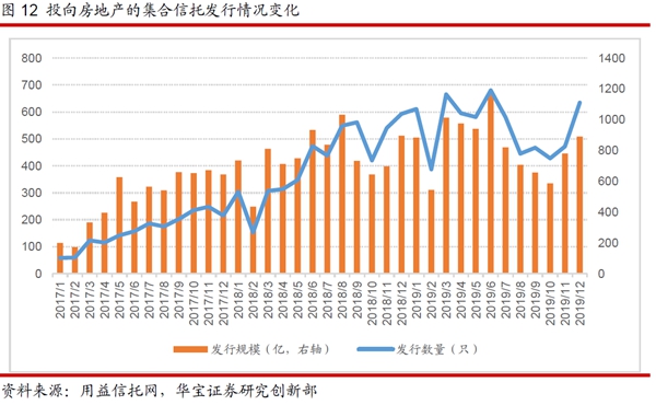 用益信托網(wǎng)統(tǒng)計的房地產(chǎn)類集合信托的數(shù)據(jù)顯示,2017-2019年三年房地產(chǎn)類集合信托發(fā)行規(guī)模分別為5921億、9209億和9965億元,2018年和2019年的同比增速分別為55.54%和8.2%。就2019年來看,上半年發(fā)行規(guī)模明顯上漲,而下半年則有所下降。具體來看,2019年上半年房地產(chǎn)類集合信托發(fā)行規(guī)模5525億,同比增加26.33%,而下半年發(fā)行規(guī)模4440億元,同比下降8.19%。主要原因在于:以5月17日“23號文”的發(fā)布為標志,地產(chǎn)調(diào)控進一步收緊,尤其地產(chǎn)融資的多個渠道均受到了明顯的限制。5月,銀保監(jiān)會發(fā)下“23號文”,要求不得向“四證不全”、開發(fā)商或其控股股東資質(zhì)不達標、資本金未足額到位的房地產(chǎn)開發(fā)項目直接提供融資;2019年7月和8月,銀保監(jiān)會對部分房地產(chǎn)信托業(yè)務增速過快、體量較大信托公司進行約談,繼續(xù)保持房地產(chǎn)信托調(diào)控力度,并進行余額管控,即每日時點規(guī)模不得超過6月30日之前的房地產(chǎn)信托規(guī)模。在監(jiān)管壓力之下,使得投向房地產(chǎn)的信托資金規(guī)模快速“剎車”。