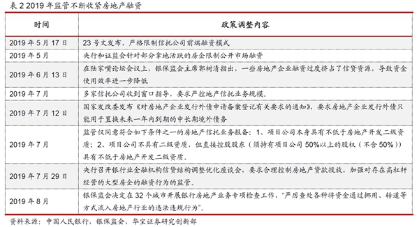 2016年國慶之后,盡管房地產(chǎn)調(diào)控政策不斷收緊,但是地產(chǎn)投資受到的影響比較小,地產(chǎn)投資增速持續(xù)上漲后維持在高位,2017-2019年三年房地產(chǎn)投資增速分別為7%、9.5%和9.9%,同時限購、限價、限貸、限售政策對于房地產(chǎn)開發(fā)商的資金回收形成較大影響,同時銀行等常規(guī)融資渠道也受到了限制,信托融資由于其靈活性受到了地產(chǎn)商的青睞。隨著2018年資管新規(guī)及其配套的各項政策的落地,政策的不確定性消除之后,房地產(chǎn)融資出現(xiàn)明顯回升,一直持續(xù)到2019年上半年。由于在2019年5月份開始政策對房地產(chǎn)的融資監(jiān)管進一步收緊,2019年下半年地產(chǎn)融資明顯回落。