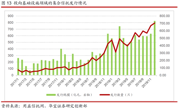 2019年下半年開始,房地產(chǎn)信托因調(diào)控而收緊,信托公司的業(yè)務則明顯轉(zhuǎn)向基礎(chǔ)產(chǎn)業(yè),2019年基建類集合信托發(fā)行規(guī)模明顯上升。具體來看,根據(jù)用益信托統(tǒng)計的數(shù)據(jù)顯示,2019年全年新發(fā)行的基礎(chǔ)產(chǎn)業(yè)類信托6981只,同比增長179.9%;新發(fā)行規(guī)模達6236億元,同比增長91.4%。其中,上半年發(fā)行規(guī)模2862億元,下半年發(fā)行3373億元?;A(chǔ)產(chǎn)業(yè)類信托發(fā)行規(guī)模明顯增長的原因主要有這三點: