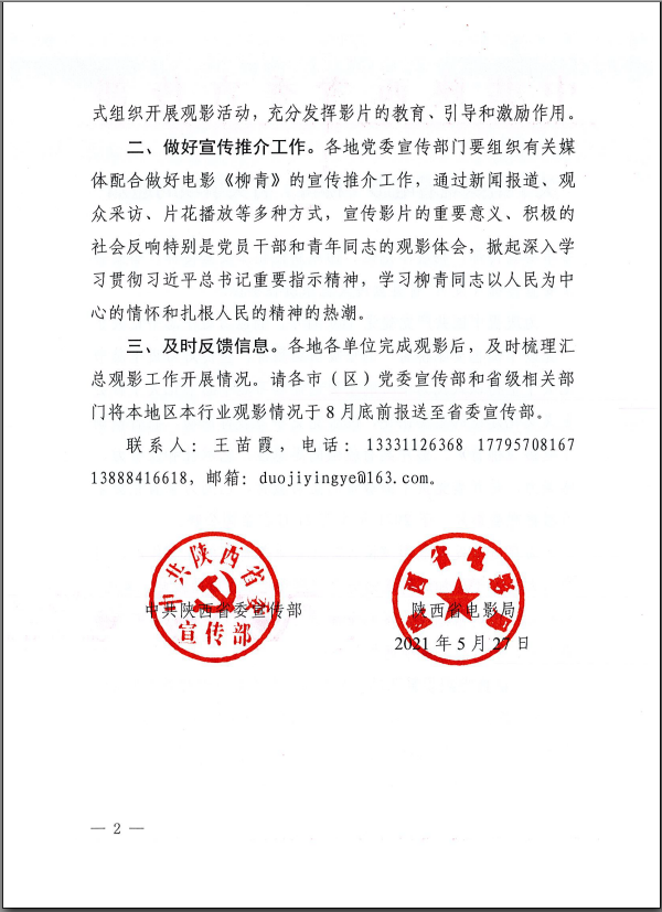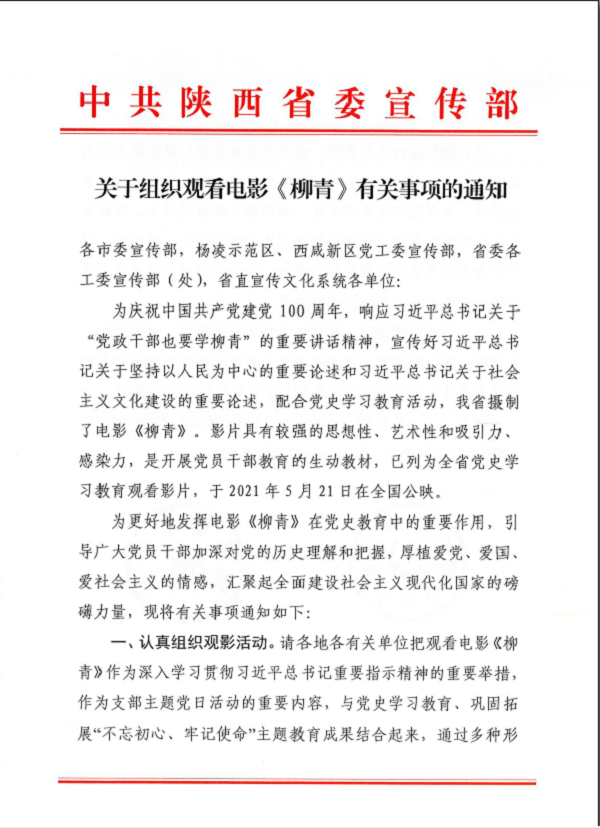 中共陜西省委宣傳部關于組織觀看電影《柳青》有關事項的通知