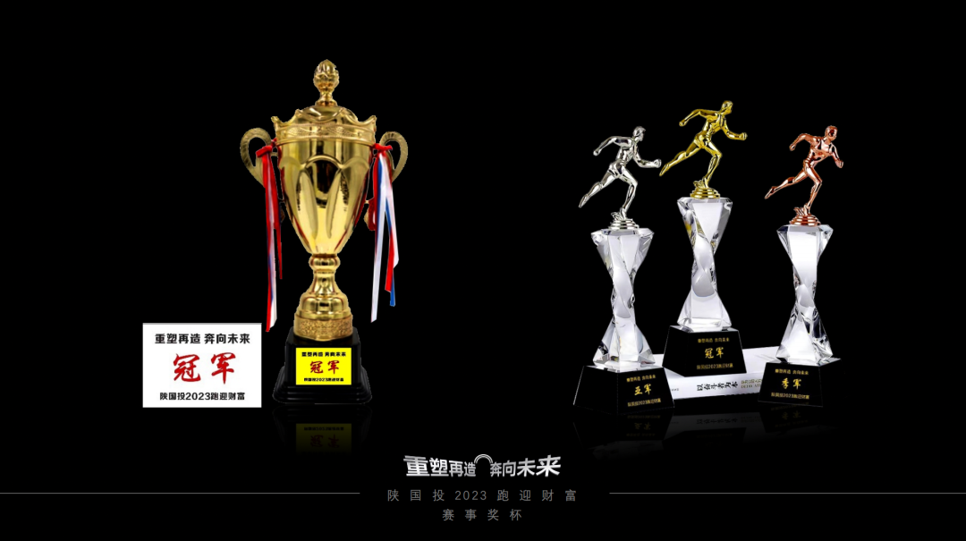 活動分別設有團隊冠亞季軍獎杯及11km個人(男子/女子)冠亞季軍獎杯,沉甸甸的獎杯除了承托著勝利的喜悅,也凝聚了榜樣的力量。集體獎杯主體設計為金色皇冠,象征著團隊的榮耀;個人獎杯主體設計為奔跑的人物形象,鼓勵參賽選手與陜國投一同在2023年奮勇向前,跑迎財富!
